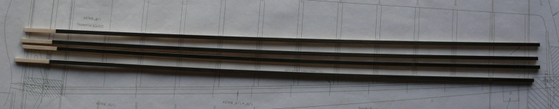 上2本が後縁材で硬めのバルサでかなり曲がっています.中の2本は前縁材で軽めのバルサでそこそこ曲がっています。下の2本はメープルのエンジンマウント材ですが今回は電動なので使いません。 |