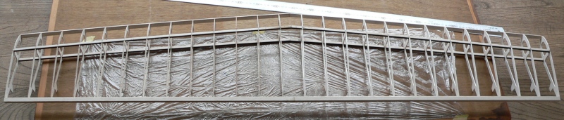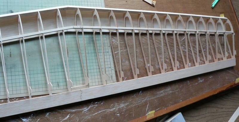 後縁材を基準で組み立てましたがリブの材料が華奢なのであちらこちらが割れて大変でした。 |