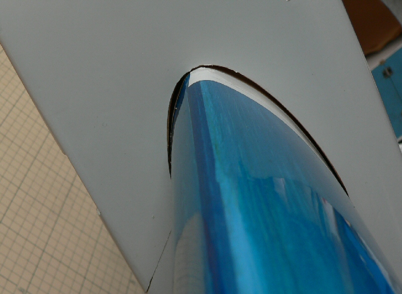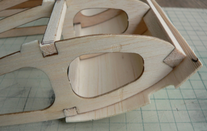 スパーより前は最大3mmぐらいの隙間があります。私の腕が悪いのではなくてカットの精度が悪いのだと思います。バルサを削って詰めていきます。 |