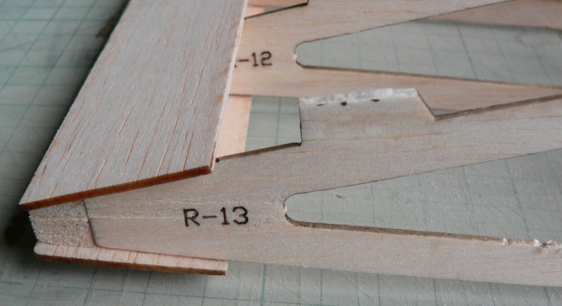 後縁材の接着は平板なので問題なしでしたが上面の前縁材のプランクではつい力をかけすぎてリブの足がかなり折れて大大変。 |