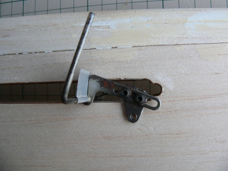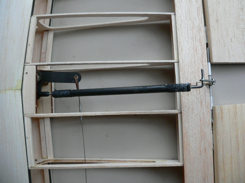 エレベーターのリンケージです。かなり大きいい穴になりましたが設計通りの胴体幅ではボールリンクを使うとつかえて動きません。ホーンの長さを短めにして舵角は40度ないぐらいしか取れませんでした。 |