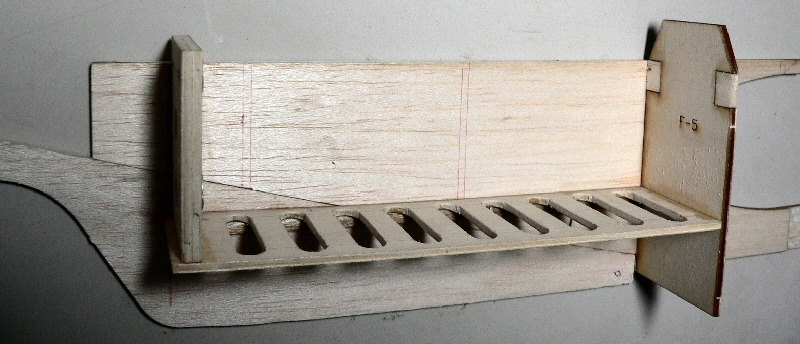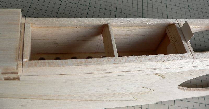 バッテリー室は上ハッチにするためにF-2とF-5の胴枠を追加して切り離しの位置がわかるように鋸目を入れてあります。側板上部に貼る部材はこの部分は接着していません。 |