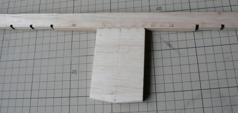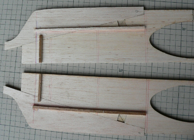 胴体側板の前後を繋ぎますがしっかり隙間があります、削って修正するのも面倒なので隙間にバルサの削り粉をすり込んで瞬間で固めてOK.前部の内張り補強材と水平安定板の補強を木工ボンドで接着。胴枠の位置などを書き込み。 |