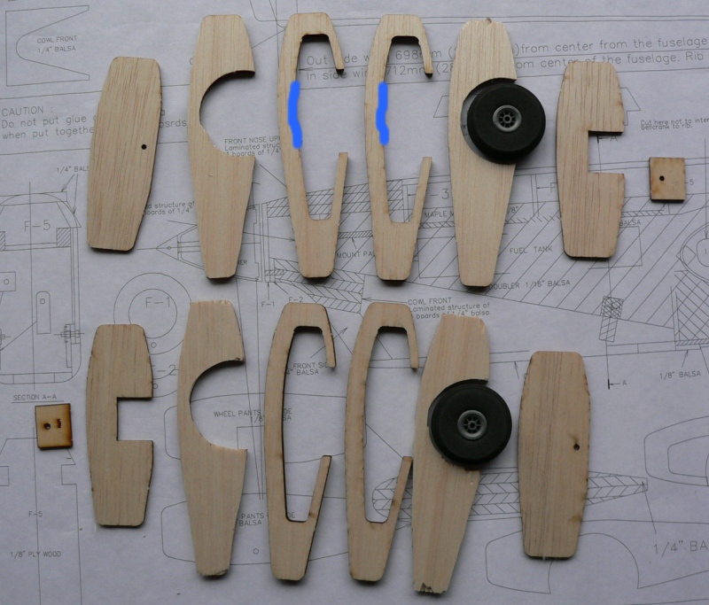ホイルパンツの材料です。中央の部材は青い線のあたりがタイヤに当たるので削る必要があります。 |