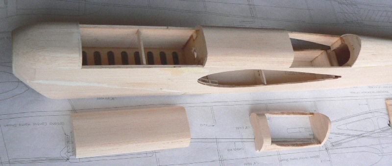 コックピット部分はリンケージをするために取り外せるように作りましたがキャノピーだけネジ止めして木部は接着することにしました。主翼の位置決めはあれやこれやと自己流で何とか納得のいく程度に仕上がりました。胴体との間に結構隙間があります。 |