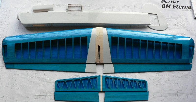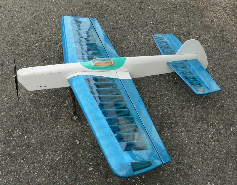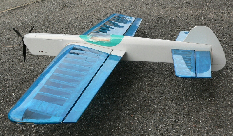 翼はオラライトのクリヤーブルー、胴体はオラライトのスケールホワイトを使いました。フラップ部分中央のクリヤーブルーが足らなかったのでアクセントがてらホワイトを使ってごまかしました。フイルム貼り終えて57g増量の705gですが気が向けばもう少し見栄え良くしようと思います。 |