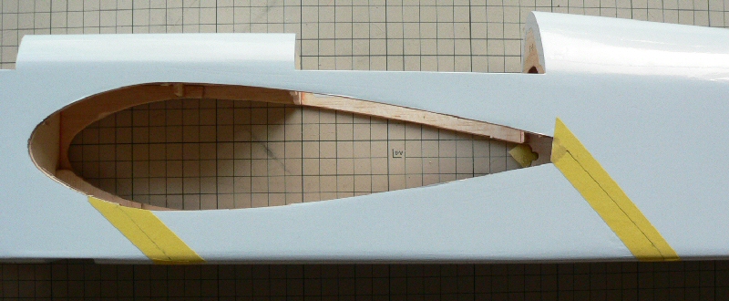 後縁材を貼ってから気付きました。プランク材は後縁材に突き付けにしないといけなかったんだ。表現が難しいですがこの写真のやり方は間違いです。 |