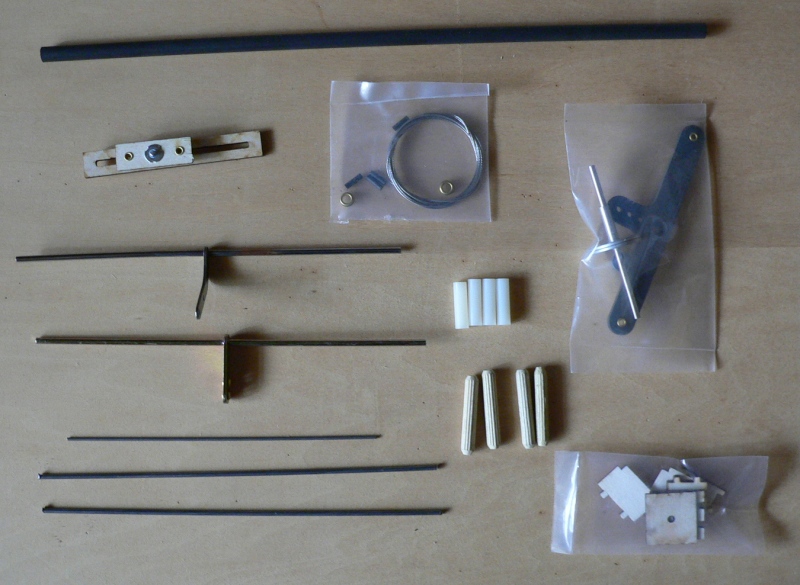 上はプッシュロッド用のカーボンパイプですが短いのが入っていないようです。ハードウエアのパックの中身はこのようのものがあります。 |