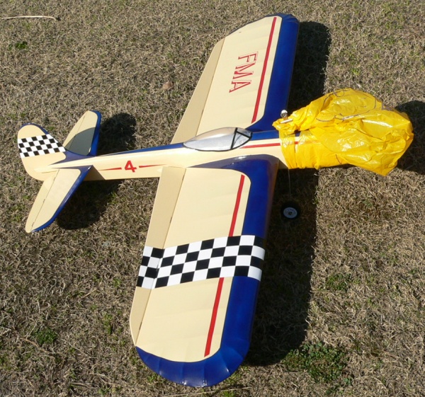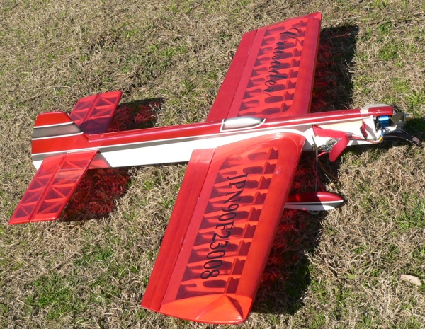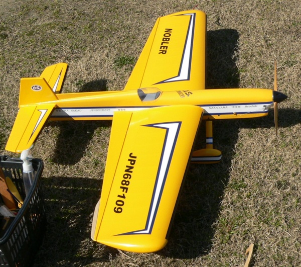 FMAでは競技開始前に1回のテストフライトをすることができます。 T中さんは練習中の頭上八の字の逆宙の時にエンストでどうしようもなく真っ逆さまに墜落。 |