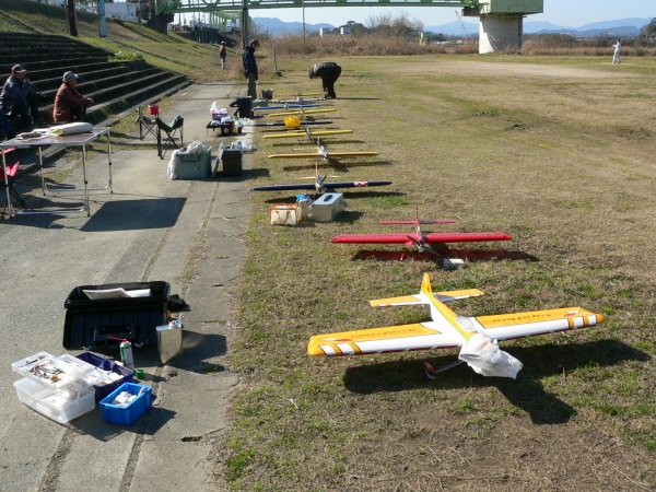 ずらりと並んだ機体です。いつもはF2Bばかりのようで年に一度の2種のため燃調に悩んでタイムオーバーしたベテランもあり、私のハンディが1.5ということもありで思いがけない結果でしたがこれはこれでもっと練習しなければと思いました。 |