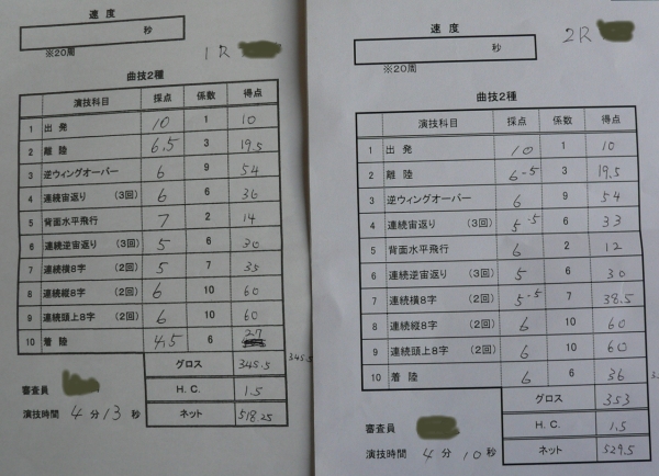 ジャッジペーパーですが得て不得手の傾向がわかります。言い訳ですがFMAでは直陸面がエリヤの半分なのでその範囲に下ろすためにあまりやらないウイップを1ランドにしたのでふらついて着陸点が悪いです。この点はまだ練習不足です。でも何とか現地点ではC級は受かりそうです。D級まではもうツースッテプの上達が必要ですね。 |