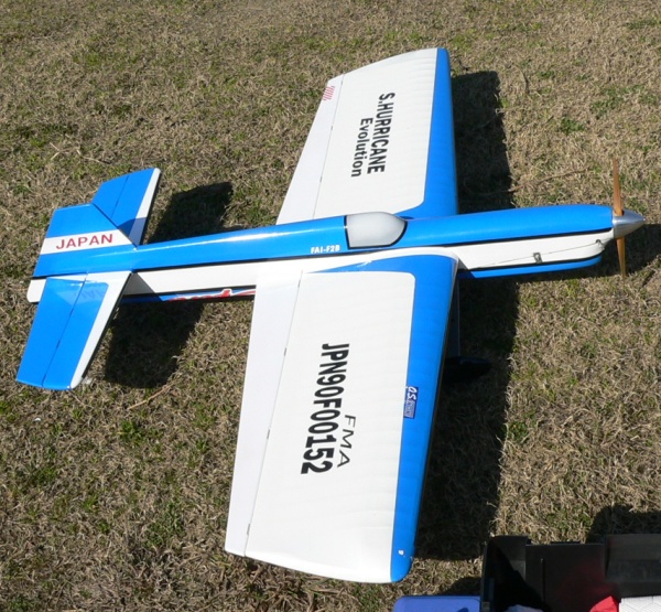 F本さんの機体はスーパーハリケーンですが自作の45サイズになっています。皆さんいろいろ作られるのには感心します。そしてよく飛んでいます。 |