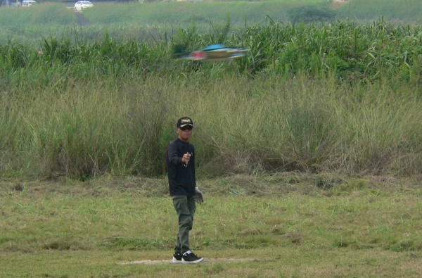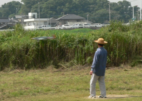 競技終了後はI田さんの飛燕のフライト。電動でモーターはE−MAX2826−06で6セルのバッテリーは450g程で電流は25Aと思いのほか少なめです、ペラは木製の13*6ぐらいでした。 |