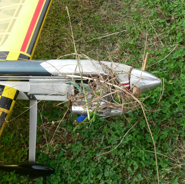 四角八の字の背面時に接地してしまいました。安心してくださいペラが折れ枯れ草がまとわり付いただけでほんの擦り傷で済みました。 |