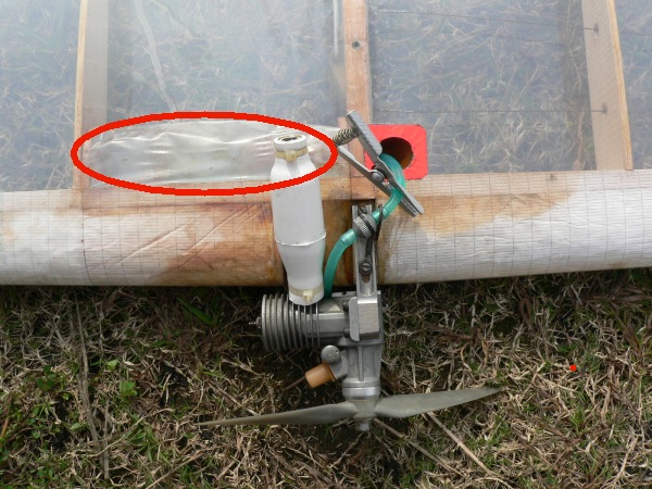 赤丸のところにゴム風船のような燃料タンクがあります。 |