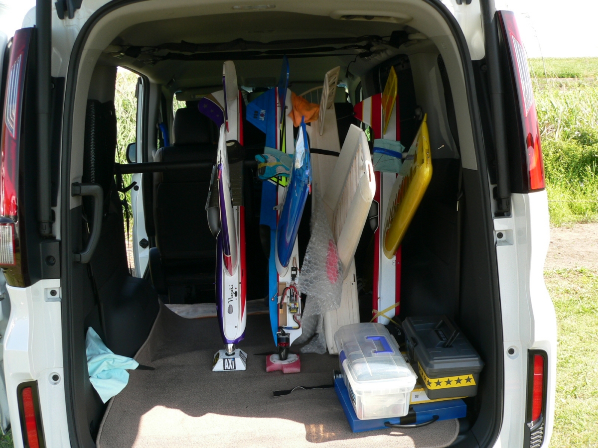 急遽フェザント2機をお持ち帰りの車の登載方法はバーに固定してスピンナーの枕がかっこいいです。