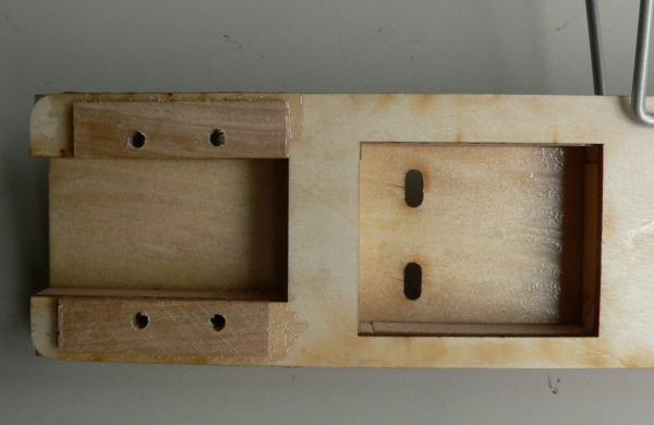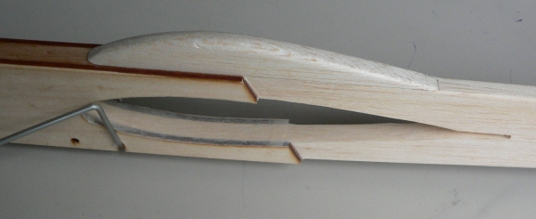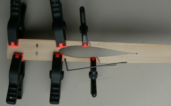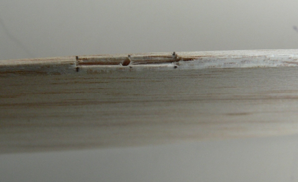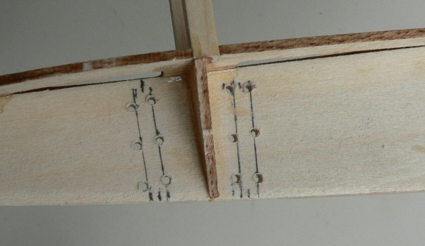 翼端のリブからはみ出したスパーなどを鋸で切り落として翼端板と補強材を接着します。リードアウトワイヤーの通る位置にしるしをして穴を開けました。 |