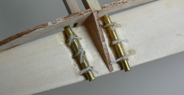 真鍮パイプを糸で縛ってエポキシ接着剤で固めます。リブが肉抜きされているので翼端版との接着面積が少ないのでエポキシを塗って盛り付けるといいでしょう。 |