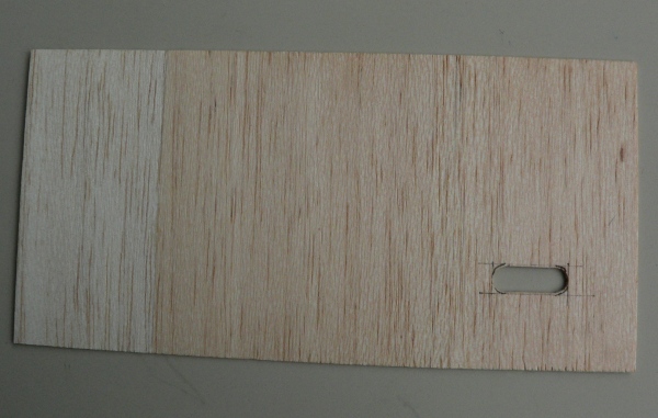 プランク材を2.5枚分張り合わせます。接合面をしっかりペーパー掛けして面を出して高粘度の瞬間で接着しました。240番のサンドペーパーで研くと綺麗な一枚板のようになります。写真は上面用でプッシュロッドが通る穴があけてあります。 |