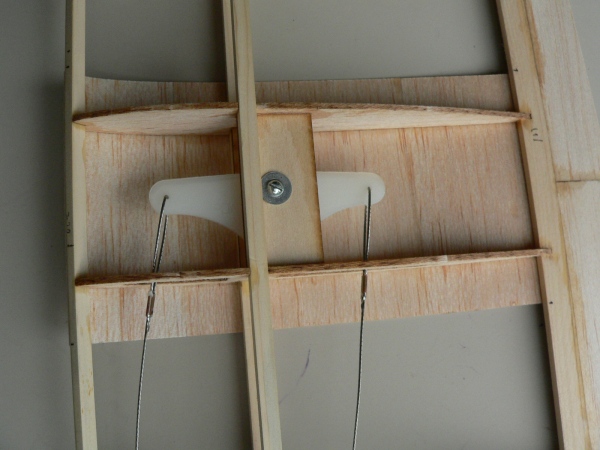 しかし、キットには入ってなかったと思う。一番上の写真に写ってないし。手持ちに2mmのピアノ線があったのでL字に曲げてエレベターホーンに付属の止め金具を使って取り付けて見た。だけど上の写真の状態ではロッドの取り付けができません。ナットがつかめるようにプランク材に穴をあけてベルクランクを取り出しました。 |