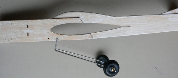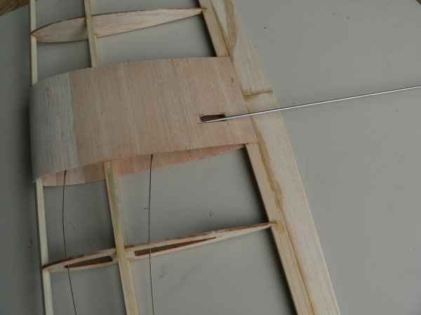 ベルクランク側もリードアウトワイヤーを取り付け半田付けしてあります。裏面のプランクをしました、図面ではリブの少し外までになっていますがよく見ないでそのままの幅でやったので広いですね。ここまで来て疑問が、プシュロッドを付けとかないと後からではできないぞ?? |