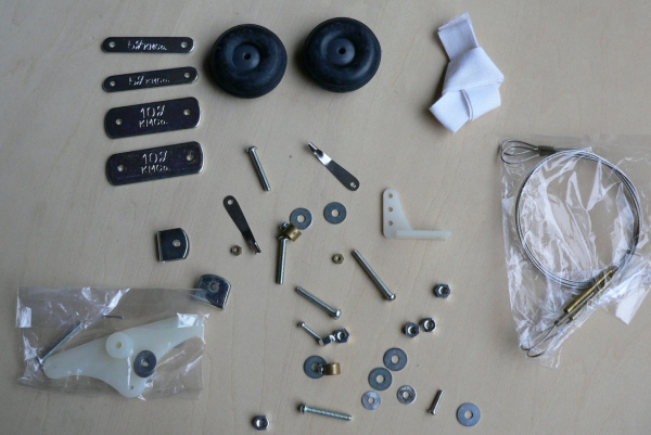 小物パーツではタイヤ、錘、リードアウトワイヤー、ベルクランクなど、ヒンジ用の布テープまで入っています。 |