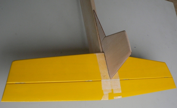 ヒンジ回りのフイルムをバルサの切り欠きに合わせて切り取り、ヒンジをさして繋ぎます。ピンバイスであけた穴に細いノズルを差し込んで低粘度の瞬間を適量しみ込ませます。多すぎると周りにはみ出して汚くなるのでこの適量は非常に分かりにくいんですが2滴ぶんぐらいかな。胴体部分に当たるところのフイルムを切り取ってから胴体にエポキシ接着剤で着けます。垂直尾翼は右にずらして取り付け機体が外向きに飛ぶようにします、そうするとワイヤーが張るようになるのでコントロールがしやすくなります。垂直尾翼があたる部分のフイルムも切り取りエポキシで接着します。フイルム部分に塗料などが付かないようにマスキングテープを張ります。 塗装が終わってから水平尾翼を取り付けたほうが良かったかなと終わった後に思いました。 |