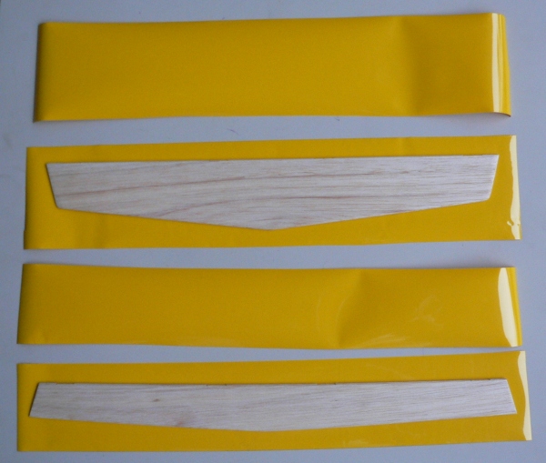 水平尾翼とエレベーターは上下二枚に分けてフイルムを張ります。今回は手持ちの中でちょうど必要なほどの大きさがあったエクセルコートの黄色を使いました。 |