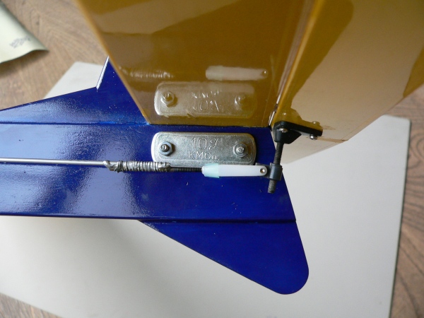 スムースに動くようにいろいろやって見ましたがなかなかしっくり来ませんでした。最終的にスタントマシーンに付いていたロッドを使うことにしました。これは専用の道具で曲げてあってクランク部分の長さと角の鋭さがきっちりと出ているので良い感じです。ペンチで曲げたのではあれだけ綺麗にはできませんでした。図面通りに下面からスペーサー、ベルクランク、ロッドで正解でした。 |