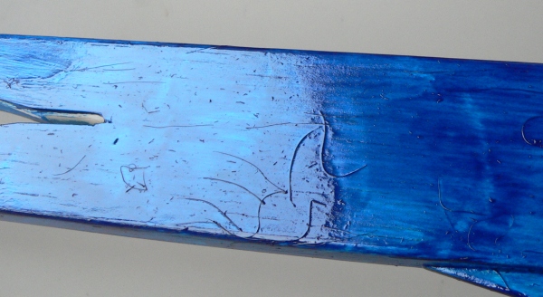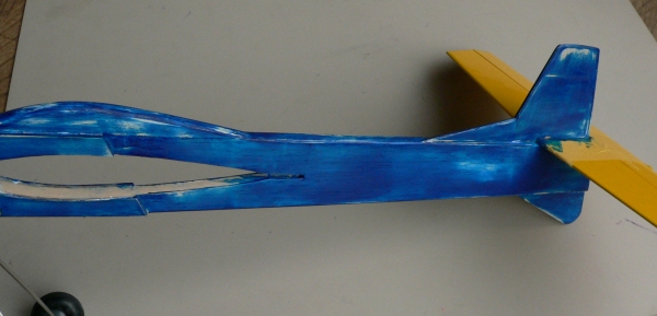 研ぎ終わったらやっぱり凄い色むらが出来ました。準備が面倒ですがガン吹きで仕上げることにします。水平尾翼があると吹き付けるとき取り回すのに便利でした。 |
