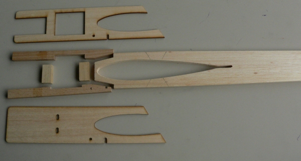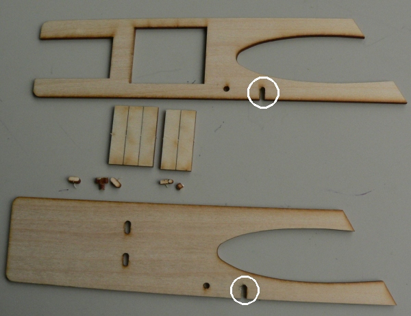 胴体の補強側版ですが今はレーザーカットになっています。白丸のところを少し広げると脚のピアノ線の収まりが良くなります。 |