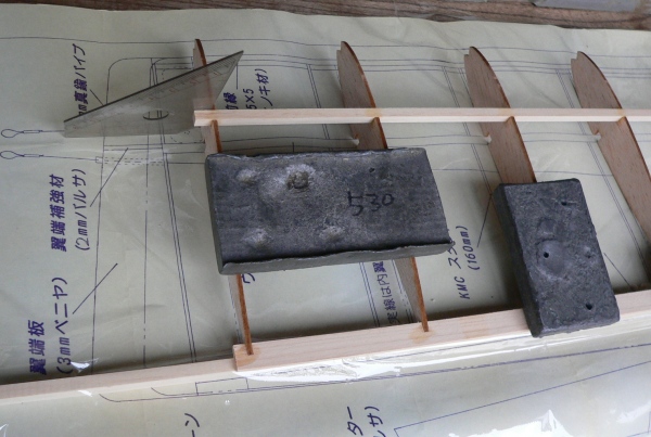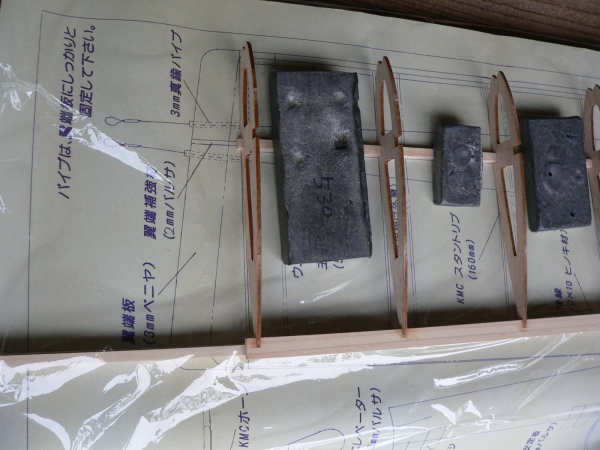 図面を定盤に広げてその上にポリラップをかぶせます。Uコン機では左側の翼が長めになっていますので間違えないように組みます。スパーを図面の位置に置き動かないように重石を乗せています。リブの厚さが26mmで後縁材の厚さが3mmなのでスパーの下に11.5mmのものをかませるといいのですが10mmのもので我慢しましたがほぼ後縁材はセンターになります。接着剤は低粘度の瞬間をしみこませます。 |