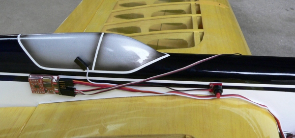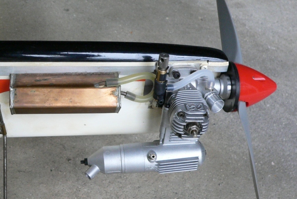 エンジンはスーパープライZ−GPのものを載せてみました。電動にする予定ですがとりあえずエンジンで飛ばして見ます。この状態で重心位置が合っているはずなので電化するときの参考になります。 |