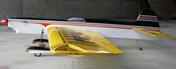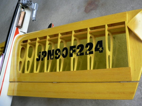 こちらは電動仕様のプロフィール45クラスと指定して作って頂きました。この状態で826g、全長1025mm全幅1350mm。翼はフイルムですが胴体はグラス貼りの塗装仕上げです。カラーリングは黒系統の1色で直線が基本です。何箇所かにグラデーション塗装がしてありますがマスキングをして多色に仕上げるより手間がかからないそうです。 |