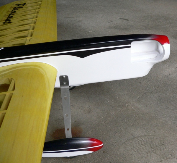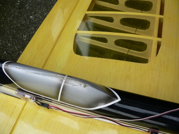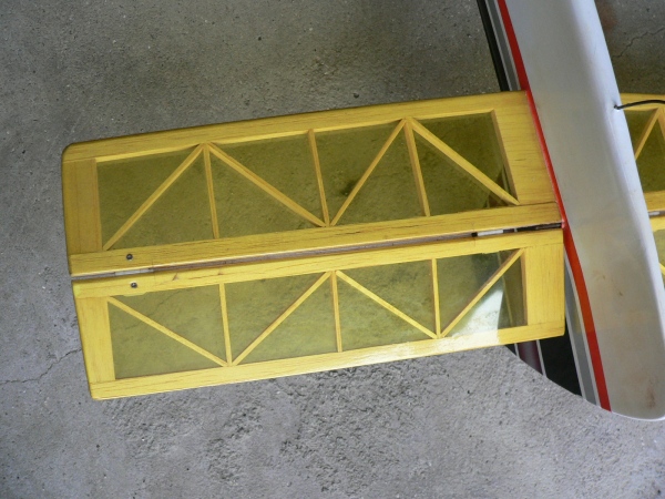 外側の2個はビス止めで全体にヒンジテープが貼られています。 このクラスの機体を飛ばす人はほとんど落とすことは無いでしょうが、今まで落としまくっては修理をしてきた自分としてはもう少し早くこの方法を知っていれば簡単に修理ができたのにと思います。 |