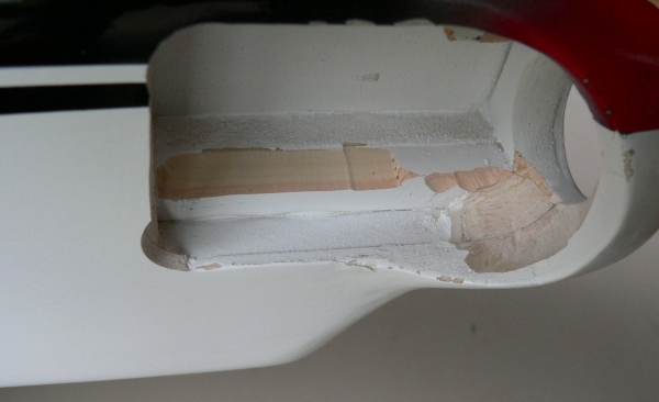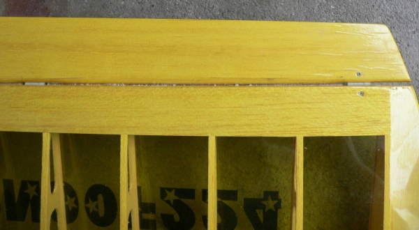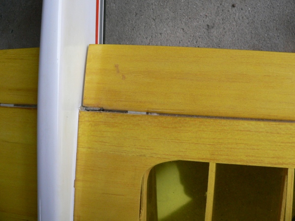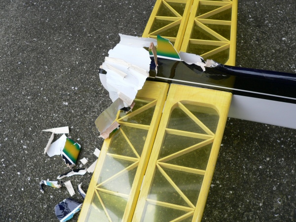 右翼端上面にも傷があるがここもそのままの予定。 結構ひどい背面着陸になたが思いのほかダメージは少なくて良かった。 |