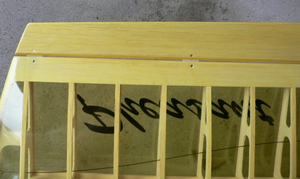 横から見るとバランスの良い側面をしているように感じます。KMCのキットの場合は基本的に素材のバルサの定尺の都合で測板の高さが75mmにせざるを得ないそうですが、この機体は一番高いところで95mmほどあります。側面積が広いほどワイヤーのテンションが強くなるらしいので小型機にはありがたいです。(ラジコンではナイフエッジで良く浮くと言います) |