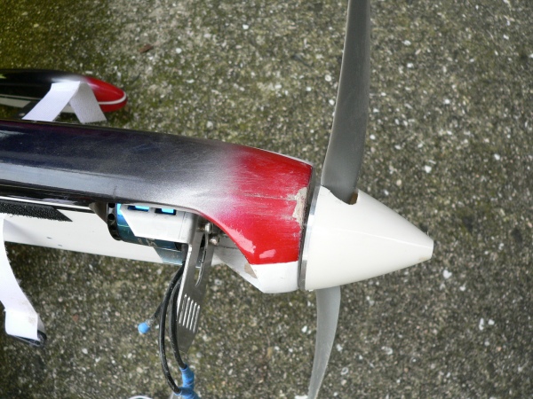 ノーズにも擦り傷が。ペラは折れたがシャフトなどは問題なし。 電動なので油が染みる心配がないので今回はこのままにしておこう。 |
