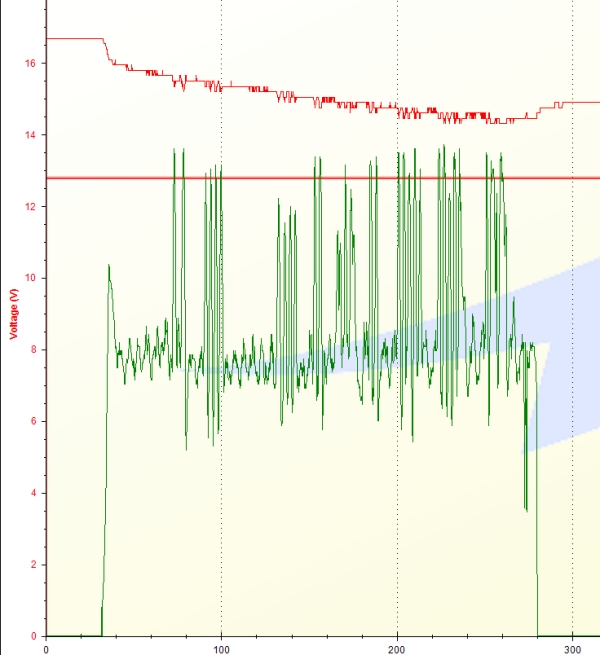 赤の横線は12.8V辺りにありますがカットオフ電圧ラインで電流値では43Aぐらいのラインになります。