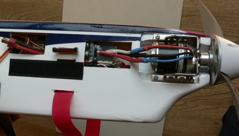 ESCはキャッスルの50ライトでモーター側のコードはできるだけ短めにバッテリー側のコードは少し短めにして軽量化しました。ESCに行く白いコードはUコンでは使わないので根元から切ってあります。 |