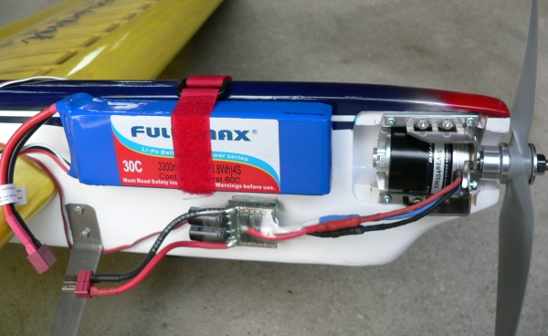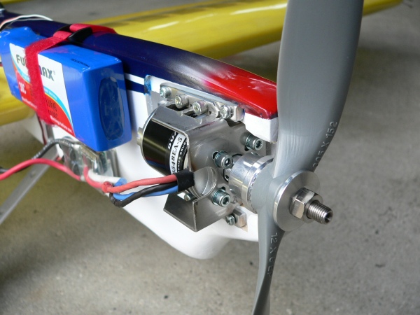 ペラはAPC12*6EP、最近は正回転で使うのがはやりだそうだが今のところ逆回転用を使います。マウントは木製でバックマウントを作れば軽くなるんですが工作が面倒だし何とか重量の余裕があったのでYam−jinさんのマウントを使いましたがヒートシンクの部分を切り取って約11gの軽量化。バッテリーの取り付けはできるだけ加工をしたくないのでベルトを通す下側だけ貫通の穴を開けています。胴体とバッテリーにもマジックテープを貼り付けてありさらに外側をマジックテープのベルトで縛ってあります。これでも墜落すると外れてどこかに飛んでいってしまうのは経験済です。 |