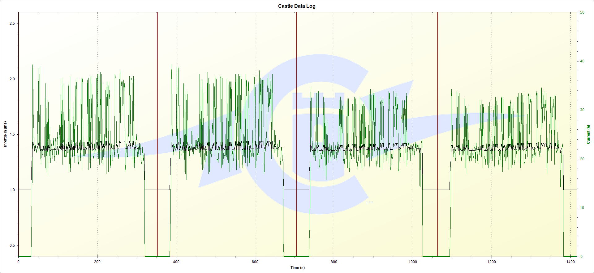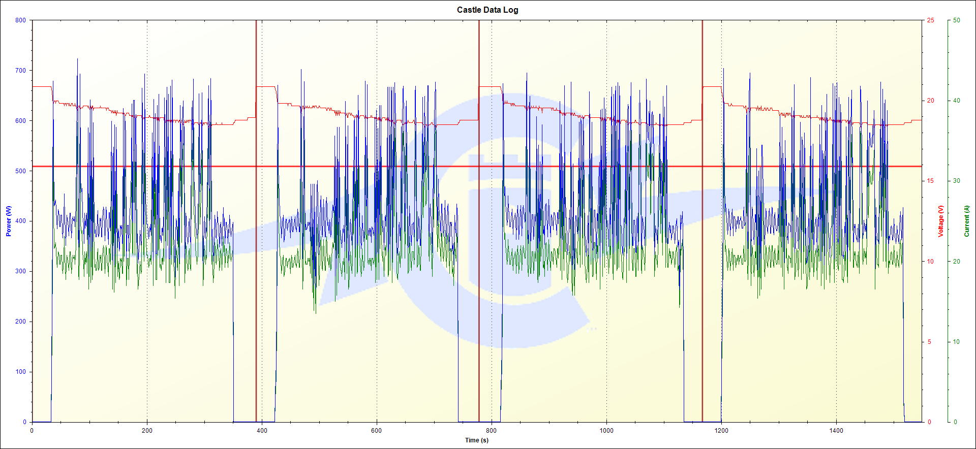 電圧は緩やかに下がっています、電流とワット数は当然比例して上下していますがGセンサーが反応してアクセルをON,OFFコントロールしているのが分かります。