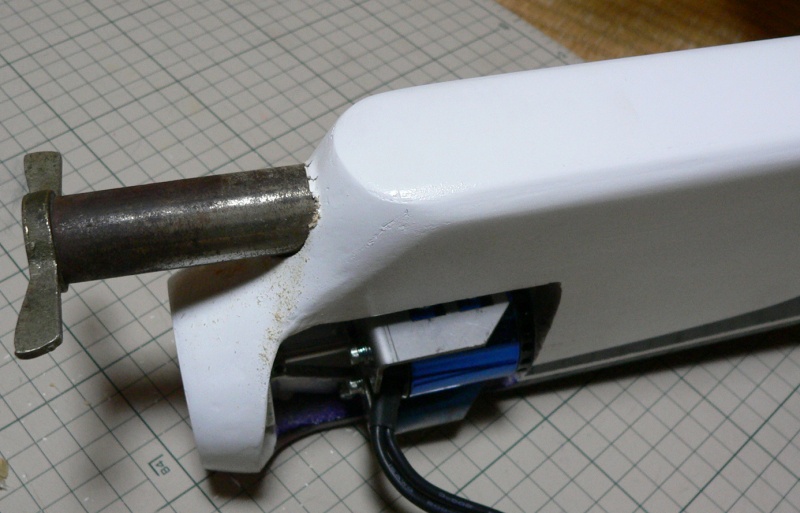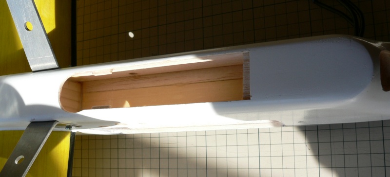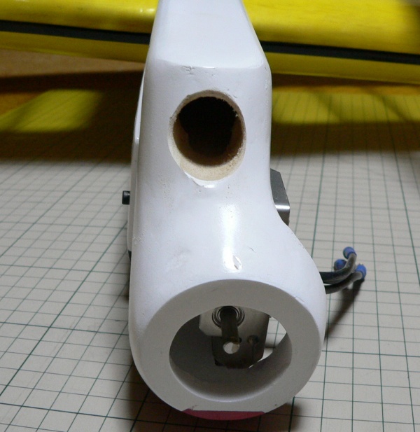 胴体下部にESCとタイマーを納めるべく長いピアノ線のドリルで中を手探りしています、脚の部分まで空洞のようです。