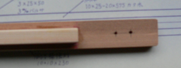 主翼の製作です、図面と少し大きさが違うので後縁材の切り欠きに合わせてスパーと前縁材にリブ位置を書きます。 |
