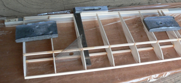 後縁材に12mmのアングルを敷いて仮組みします。それぞれの直角を確認しながら低粘度の瞬間を流して固定していきます。 |