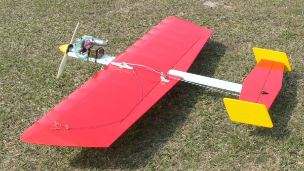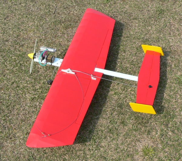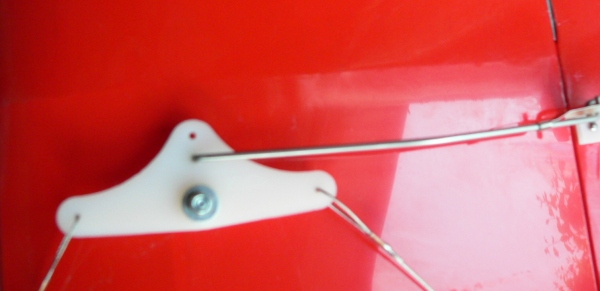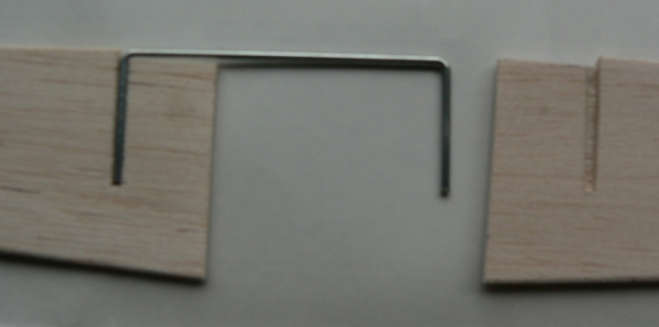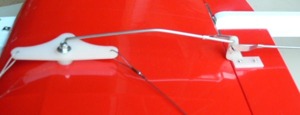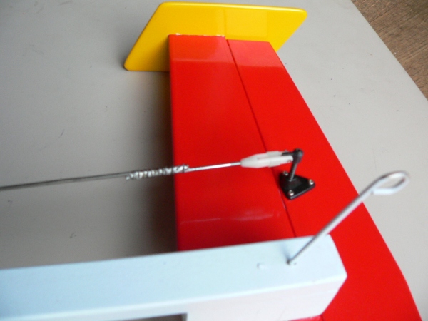 このロッドは長めに作っておいて曲げて調整します。この状態ではロッドがフラップに当たってエレベーターは大きな舵角が取れませんが水平飛行の練習には問題ないでしょう。 |