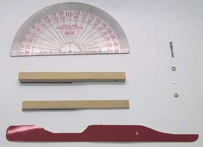 用意するもの 分度器:大きいほど測りやすいが幅12cmぐらいが良い 角材2本:長さ10cmぐらいで一つは厚さ5mm以上(ビスを打てる厚さがあればよい) 2mmビス、ワッシャ、ナット2個 針になるもの:FRPやプラ板などで薄いものが加工しやすい 他に輪ゴム |