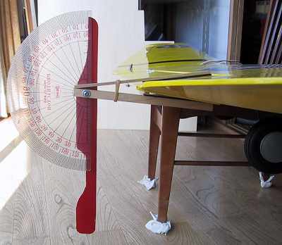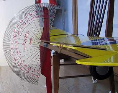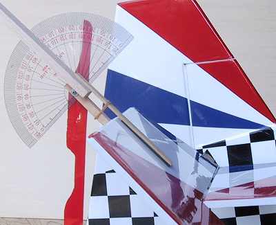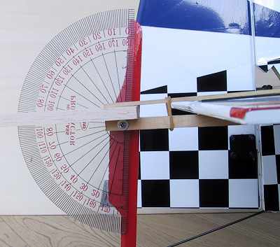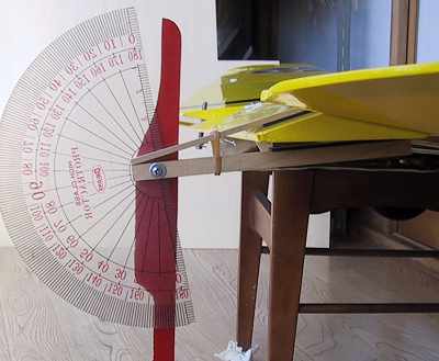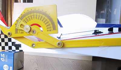 動翼がテーパー状の場合は御覧のようにして挟みます。 ニュートラルを0度に合わせて。 |