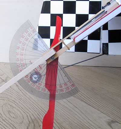 組み立てです。 ビスにワッシャを入れてヒノキ棒を通し分度器を通してビスでしめます。分度器が手で動くぐらいの堅さで。 針を通してビスで締めますがこれは軽く動くように。 0と180度のラインに沿って目盛りが見えやすいように針を切り欠きます。向きはどちらでもかまいません。こんな形になりましたがお好みでどうぞ 片方はそのまま伸ばしておいて重りの役目をします そしてもう一本の棒材を輪ゴムで束ねます、私は滑り止めにゴム板を張りました。 輪ゴムを使うことでいろんな形の翼に対応できます。 |