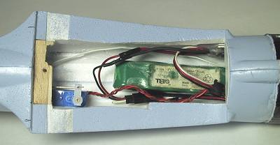 画面で右上にアンプを両面テープで接着、バッテリーはマジックテープで取り外し式。エレベーターサーボも両面テープで御覧の感じ。受信機はGWS−4Pを一番前方に押し込んである。画面右側が前です。 |